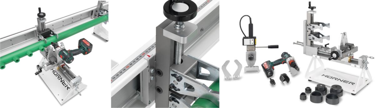 The standard delivery includes the all-purpose pipe aligners for straight pipelines sized O.D. 40 - 160 mm, a bracket compatible with various cordless drills/screwdrivers Ø 43 mm driving the drilling head, and clamps for branch-offs in the saddle position sized up to O.D. 63 mm allowing precision alignment of cylindrical and octagonal fittings.